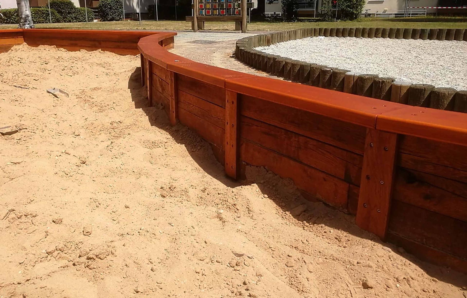 Dieser Spielplatz befindet sich in der Wohnanlage der Bundesanstalt für Immobilien im Dresdner Hechtviertel, Johann-Meyer-Straße. Im Auftrag des Vermieters wurde die Anlage von uns aufgearbeitet. Der Sandkasten erhielt eine neue Einfassung, der Spielturm eine Aufarbeitung aus Eichenbalken.